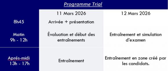 Perfectionner sa technique en trial pour atteindre un niveau équivalent aux TEP. D’être en mesure, à l’issue de la formation, de s’entraîner de manière autonome et de savoir « tracer » des zones trial afin d’optimiser ses chances de réussite aux TEP.